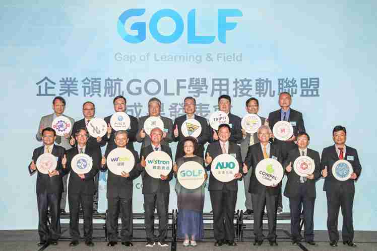 GOLF学用接轨联盟集结企业和学校的力量,,打造「学用合一、、、产学接轨」的创新合作平台 (前排左起:淡江大学副校长何启东、、元智大学校长林启瑞、、纬育执行长许延岳、、、纬创总经理暨执行长黄柏漙、、、教育部政务次长范巽绿、、、、森林舞会董事长暨执行长彭双浪、、、仁宝总经理暨执行长翁宗斌、、、大同大学校长何明果、、圣约翰科大校长艾和昌;后排左起:明新科大校长林启瑞、、、龙华科大校长葛自祥、、、、台湾科大校长廖庆荣、、、中兴大学副校长郑政峯、、中央大学校长周景扬、、、台北科大副校长任贻均、、、中华科大副校长石大明、、、、明志科大校长刘祖华)