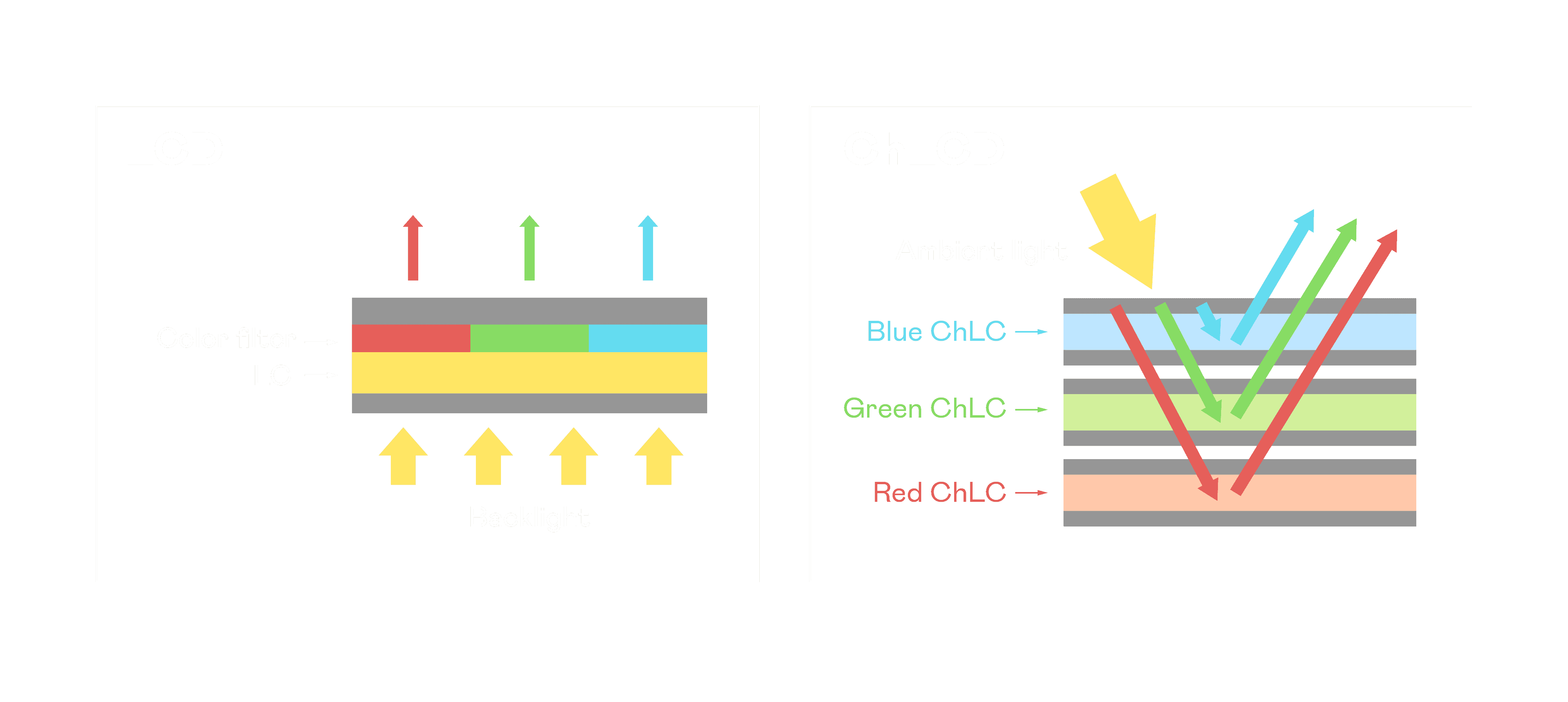 森林舞会胆固醇液晶显示器是由红、、、、绿、、、、蓝三层胆固醇液晶面板堆叠而成,,,,并采用无彩色滤光片设计,,,减少环境光在反射过程中的损耗。。。
